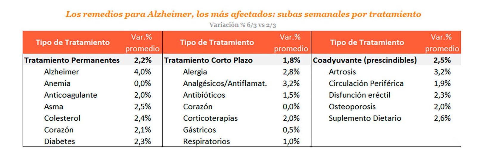 En el caso de los tratamientos permanentes, los aumentos promediaron el 2,2%. La suba más empinada fue la de los remedios para tratamiento del Alzheimer, nada menos que 4% en una semana, en tanto aquellos pra el tratamiento del asma aumentaron el 2,5%, para el colesterol 2,4 y para la diabetes 2,3%, pero no hubo variaciones en los remedios para tratar casos de anemia.