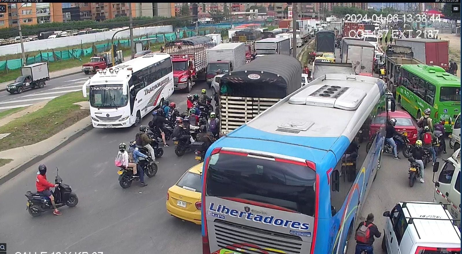 Con una mañana gris y leves lluvías se inicia la jornada del 6 de abril en la capital colombiana. Los principales corredores viales muestran congestiones especialmente en las salidas del casco urbano. La autopista norte, en sentido sur-norte muestra tráfico pesado desde la calle 170 hasta la 200. La calle 170 también está moderadamente congestionada en sentido occidente-oriente.