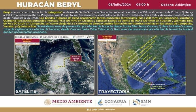 De acuerdo con el último corte del SMN, Beryl como huracán categoría 3 en la escala Saffir-Simpson, mantiene su trayectoria hacia la Península de Yucatán. Se pronostica que impacte durante la madrugada del viernes como huracán de categoria 3 o 2 en Tulum, muy cerca del municipio de Solidaridad, incluyendo la isla de Cozumel, Q. Roo. Las bandas nubosas de Beryl ocasionarán lluvias intensas a puntuales torrenciales, vientos intensos y oleaje elevado en la Península de Yucatán.