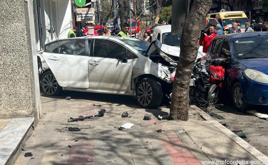 El siniestro quedó registrado por las cámaras de seguridad ubicadas en la zona de Chacabuco y el boulevard Arturo Illia, en la zona este del centro cordobés. Según lo que se pudo reconstruir, el acusado conducía un Toyota Corolla blanco a alta velocidad, cuando perdió el control y se estrelló contra varios autos, motos y peatones que circulaban por la vereda.